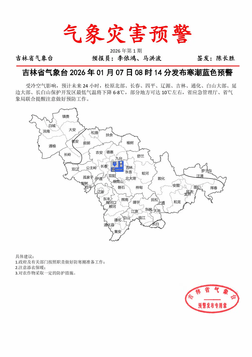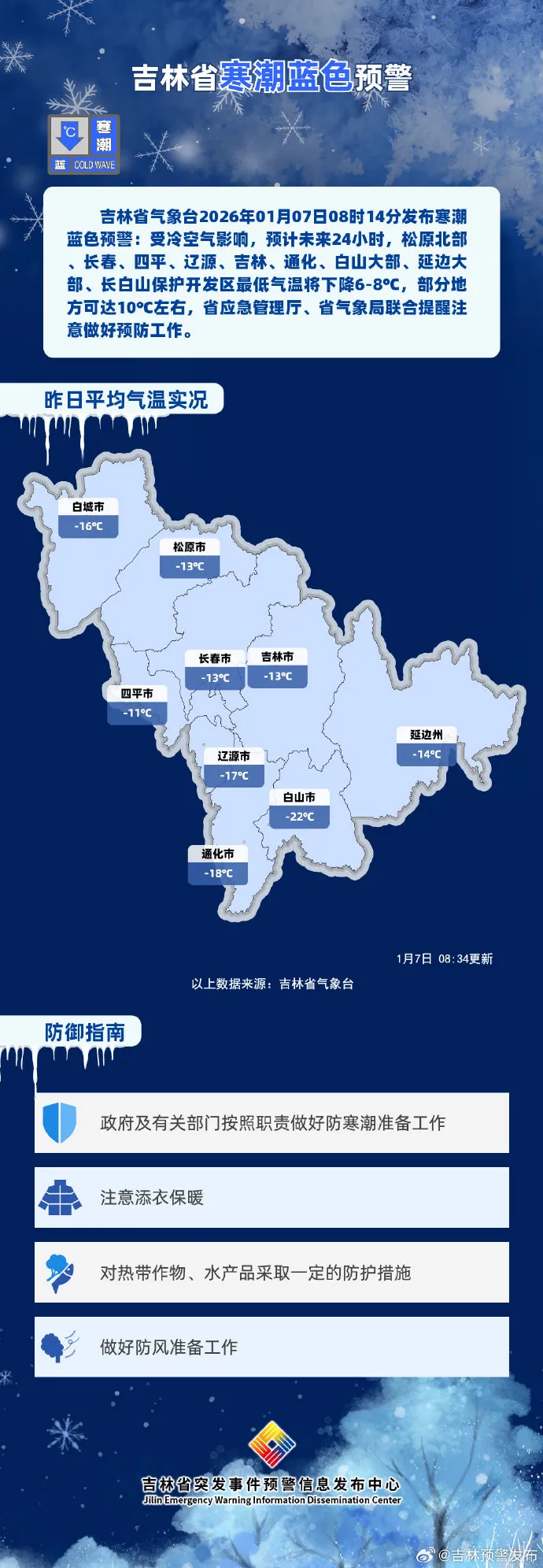 찬공기의 영향으로 향후 24시간 동안 송원 북부, 장춘, 사평, 료원, 길림, 통화, 백산 대부분 지역, 연변 대부분 지역, 장백산보호개발구의 최저기온이 6~8℃ 하락할 것으로 예상되며 일부 지역은 10℃ 정도 떨어질 수 있을 것으로 예상된다. 이에 길림성응급관리청, 기상국에서는 예방조치를 잘할 것을 당부했다.