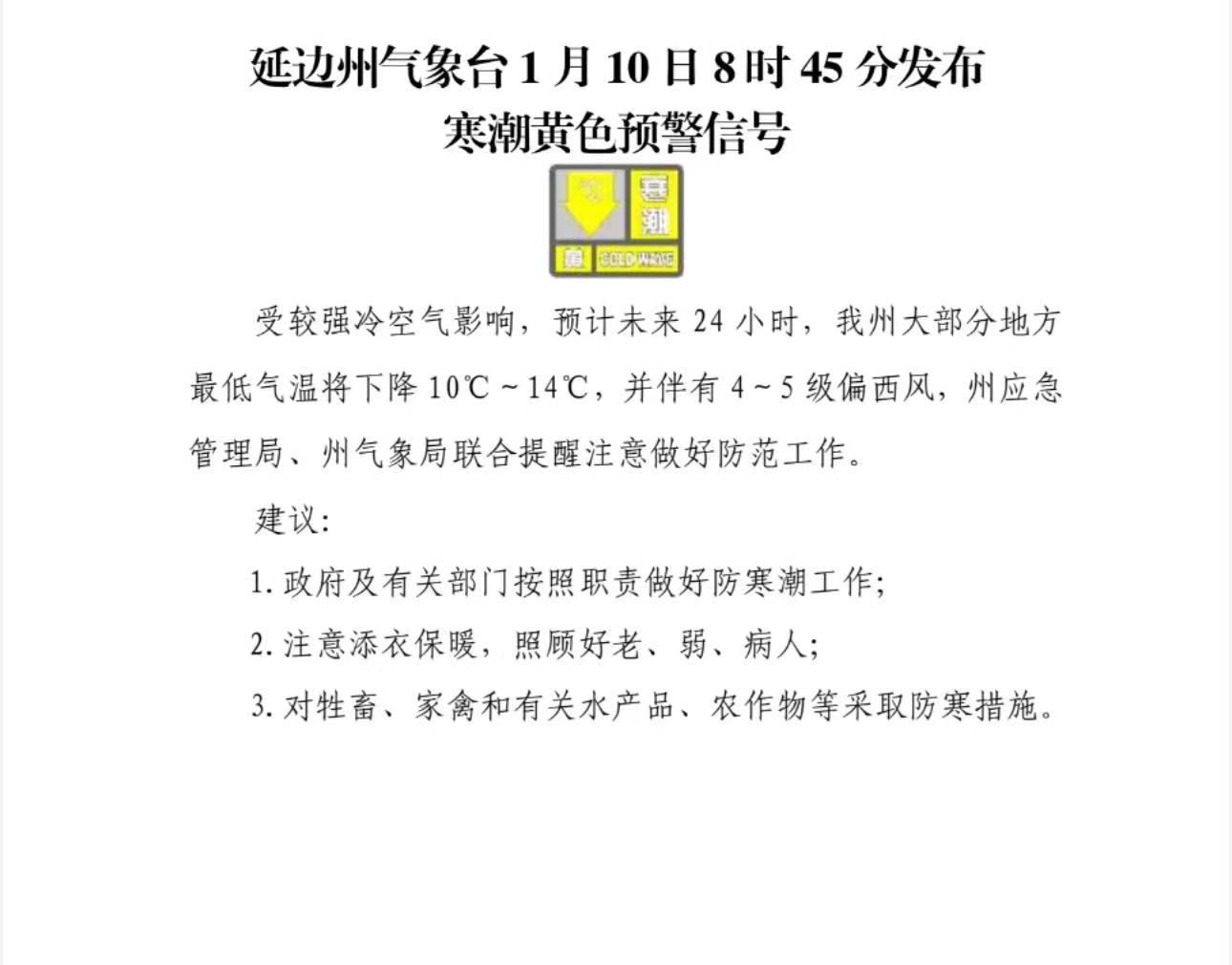 연변주기상대는 1월 10일 8시 45분에 한파 황색 조기경보를 발부했다. 찬공기의 영향으로 향후 24시간 우리 주 대부분 지역의 최저 기온은 10℃~14℃ 하강하고 4~5급의 편서풍이 동반될 것으로 예상된다. 이에 주응급관리국과 주기상국에서는 련합으로 방비작업에 주의 기울일 것을 당부했다.