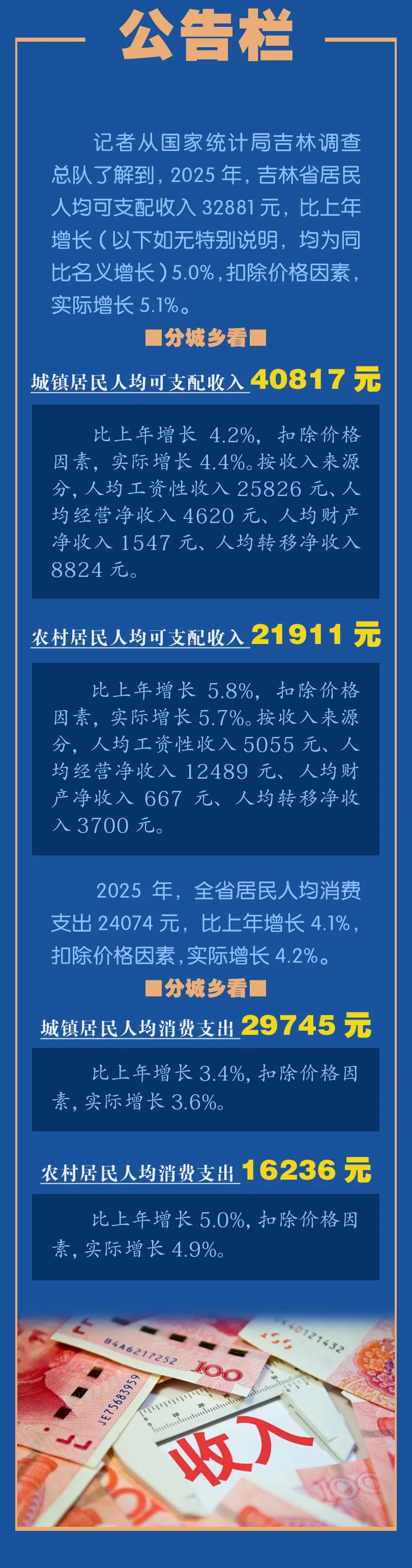 국가통계국 길림조사총대에서 알아본 데 따르면 2025년 길림성 주민 1인당 가처분소득은 32,881원으로 전년 대비 5% 증가(이하 별도 설명이 없는 경우 모두 동기 대비 성장률)했으며, 물가요인을 제외한 실제 성장률은 5.1%이다.