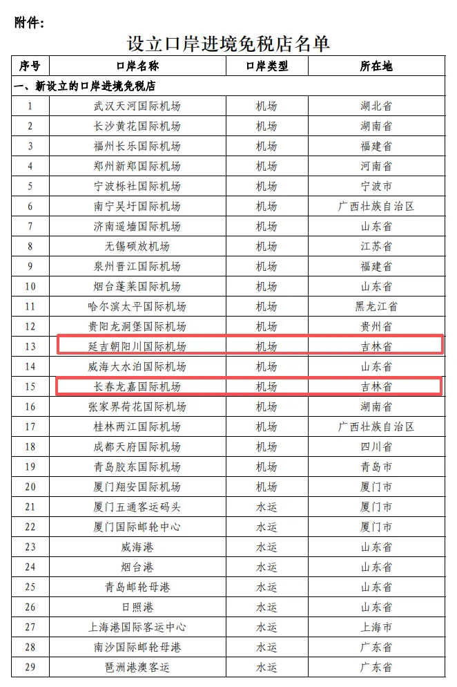 그중 길림성은 3곳에 면세점 신설을 비준받았는데 각기 연길조양천국제공항, 장춘룡가국제공항,훈춘도로이다.