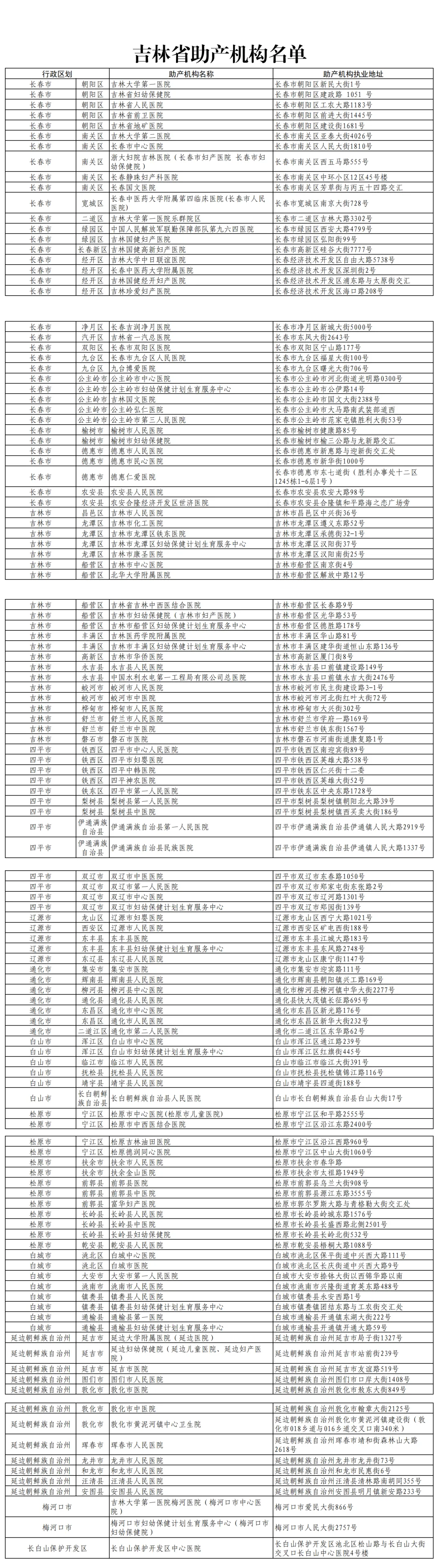 대중의 진료편의를 돕기 위해 '조산봉사관리 강화에 관한 국가위생건강위원회 판공실 통지'(국위판 부유발〔2024〕7호) 요구에 따라 길림성 조산기구 명단을 다음과 같이 공포한다.(2025년 12월 31일까지).