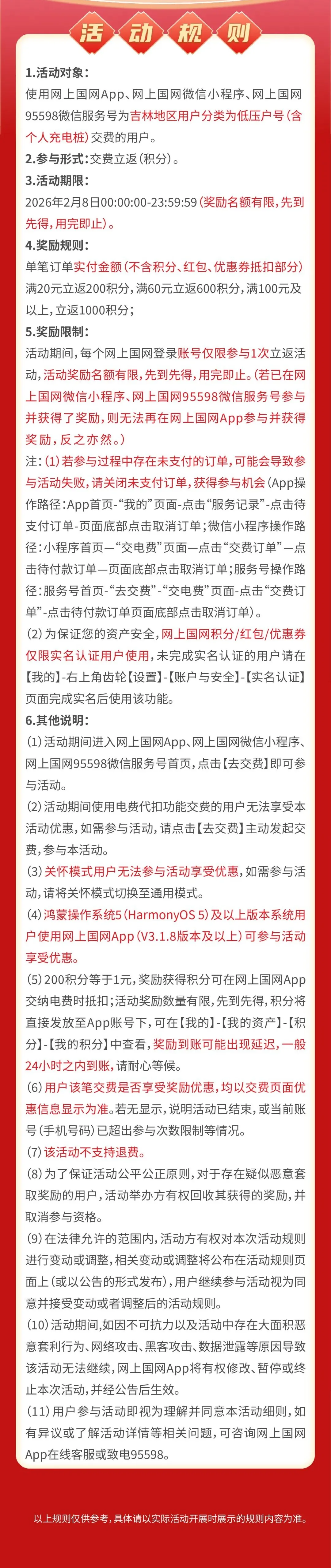 참여대상: 길림성 일반 가정용 전기계정번호(低压户号)(개인충전설비 포함)를 보유한 사용자로서 길림성 '온라인 국가전력망'앱, '온라인 국가전력망' 위챗 미니응응프로그램 또는 '온라인 국가전력망' 95598 위챗계정을 통해 전기료금을 납부하는 대상자.