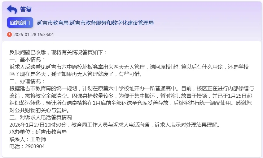 2026년 1월 27일, 교육국 사업일군이 소구인과 전화로 소통했으며 소구인은 처리결과에 대해 리해를 표했다.