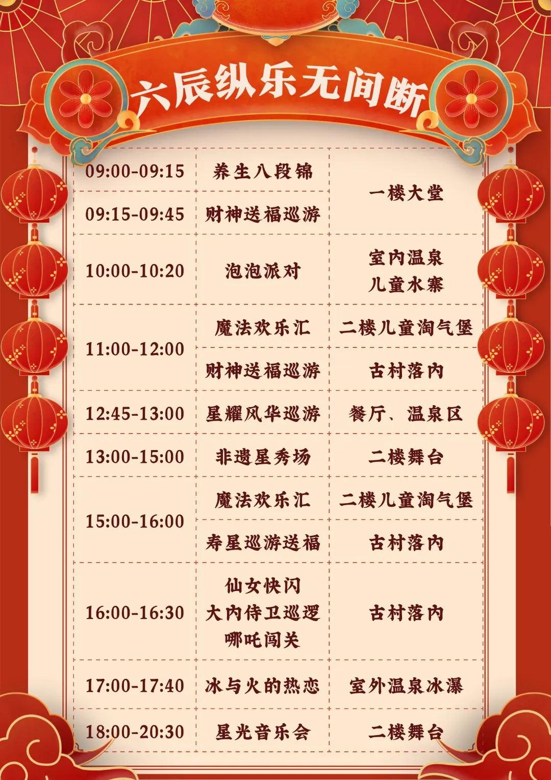• 동심 소통: 온천 실내 아동락원에서 버블파티가 펼쳐진다. 형형색색의 비누방울이 신나는 음악에 맞춰 한가득 퍼져나가 온가족이 마음껏 즐길 수 있다. 친자마법환락회는 마술사를 초청해 근거리마술과 풍선 DIY를 선보이며 어린이들은 예쁜 풍선장식을 무료로 받을 수 있다.