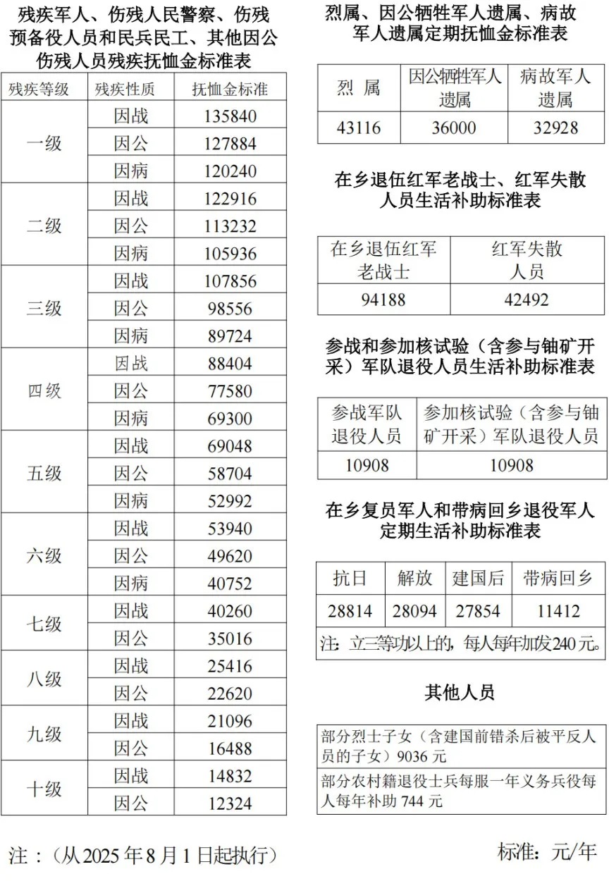 퇴역군인사무부, 재정부의 <일부 우대무휼대상 등 인원의 무휼과 생활보조기준을 조정할 데 관한 통지>(퇴역군인부 발〔2025〕42호) 요구에 따라 성정부의 비준을 거쳐 2025년 8월 1일부터 일부 우대무휼대상 등 인원의 무휼과 생활보조기준을 조정하기로 결정했다. 아래 관련 사항을 다음과 같이 통지한다.