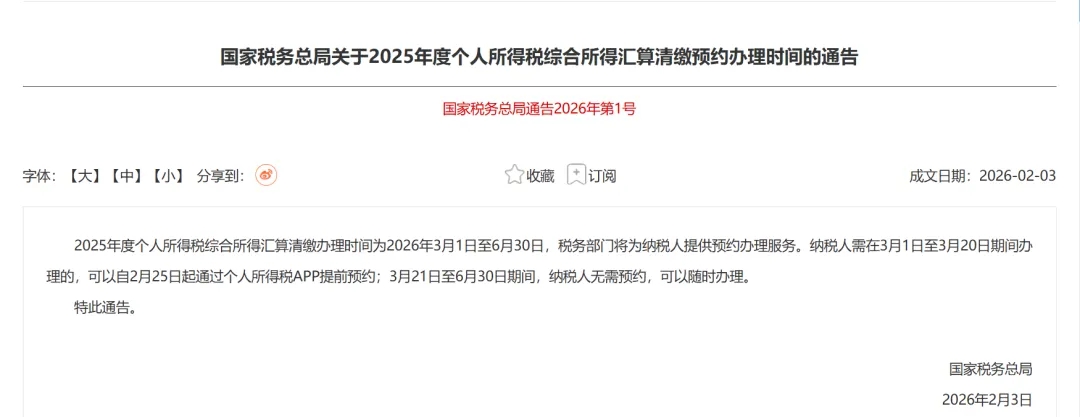 2월 3일 국가세무총국은 통고를 발부하고 2월 25일부터 납세자들이 개인소득세 앱을 통해 2025년도 개인소득세 종합소득 정산 처리를 예약할 수 있다고 밝혔다.