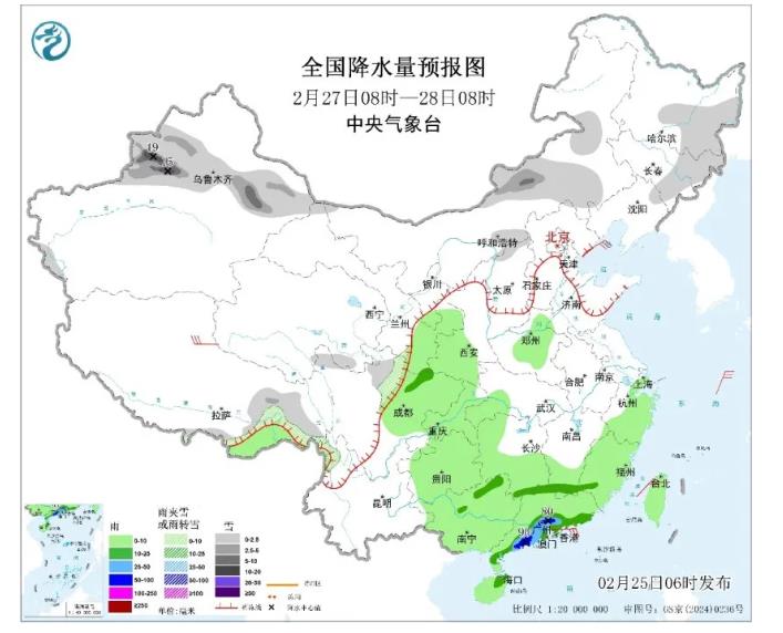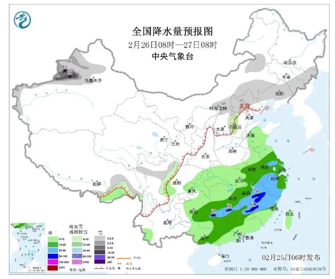 2월 26일, 내몽골 동남부와 중부, 동북지역 동부와 남부, 신강 서북부, 서장 동부, 화북 북부, 천서고원 북부 등 일부 지역에 작은 눈 또는 진눈깨비가 내리고 그중 신강 북강 북부와 이리하곡 등 지역에는 폭설이 내린다. 강회 대부분, 강남 대부분, 화북 북부, 광서 동부 등 일부 지역에는 중간 내지 큰비가 내리고 그중 호남 남부, 강서 중남부, 복건 서북부, 광서 동북부 등지에는 폭우가 예상된다.