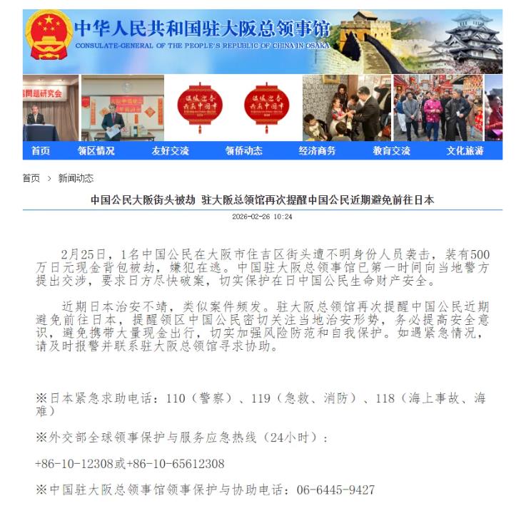 2월 25일, 오사카시 스미요시구 거리에서 한 중국공민이 신원이 분명하지 않은 사람의 공격을 받아 500만엔이 든 현금배낭을 도난당했고 용의자는 현재 도주중이다. 오사카주재 중국령사관은 즉각 현지 경찰측에 교섭을 제기하여 일본측에서 조속히 사건을 해결하고 일본에 거주하는 중국공민의 생명과 재산안전을 확실하게 보호할 것을 요구했다.
