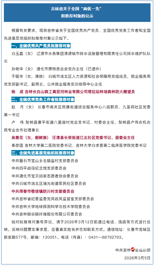 길림성당위 조직부에서는 3월 5일 관련 요구에 따라 길림성의 전국 우수 공산당원, 전국 우수 당사업일군 및 전국 선진 기층 당조직 추천 대상을 공시했다. 그중 우리 주의 양성이 전국 우수 공산당원 추천 대상으로, 오선화가 전국 우수 당사업일군 추천 대상으로, 훈춘시경신진방천촌당지부 위원회가 전국 선진 기층 당조직 추천 대상에 이름을 올렸다.