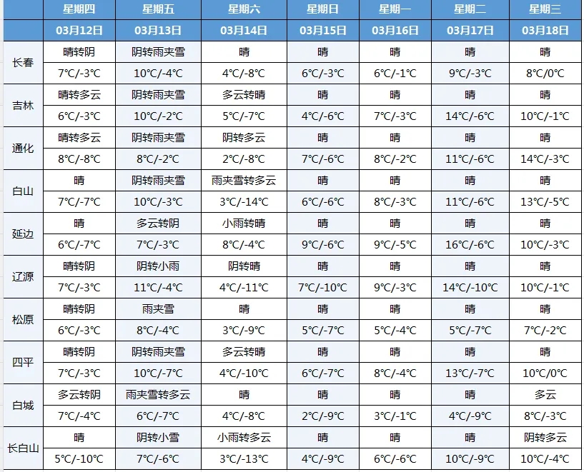 본격적인 강수는 13일 밤부터 14일 낮에 집중될 것으로 예상되는바 연변을 포함한 전 성 대부분 지역에서 비와 눈이 섞여 내리는 현상이 나타날 것으로 보인다. 특히 길림 동부와 백산 북부 일부 지역에는 중등 정도의 눈이 예상된다.