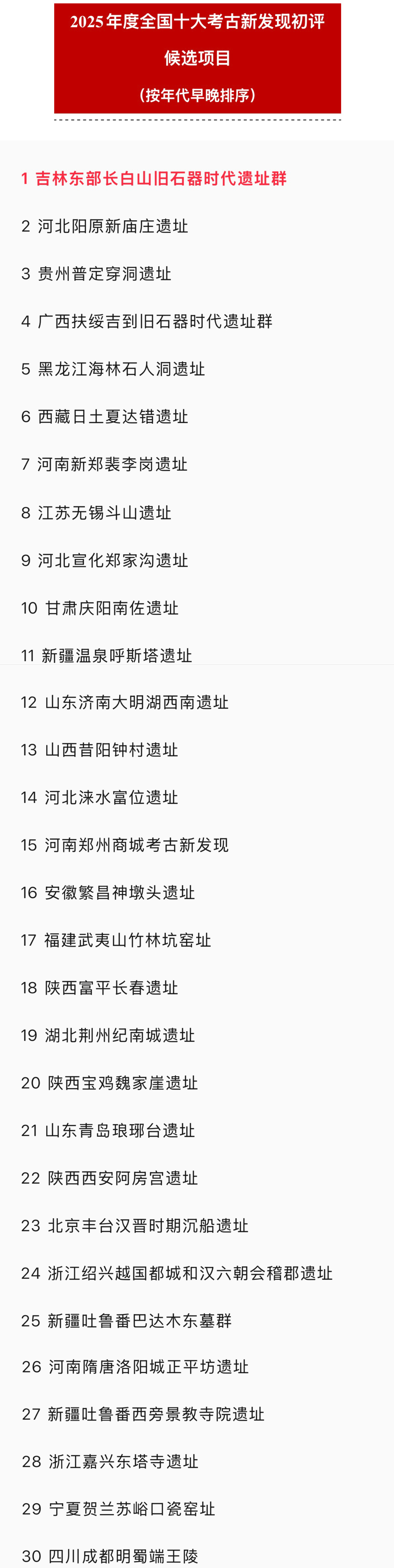 3월 12일, 2025년도 '전국 10대 고고학 새 발견' 1차 심사가 가동됐다. 국가문물국의 심사를 거쳐 최종 30개 항목이 참가 대상으로 확정되였는데 그중 길림성 동부 장백산 구석기시대 유적군이 명단에 올랐다. 활동판공실은 향후 투표를 통해 20개 항목을 추천해 최종 평가에 진출시키게 된다.