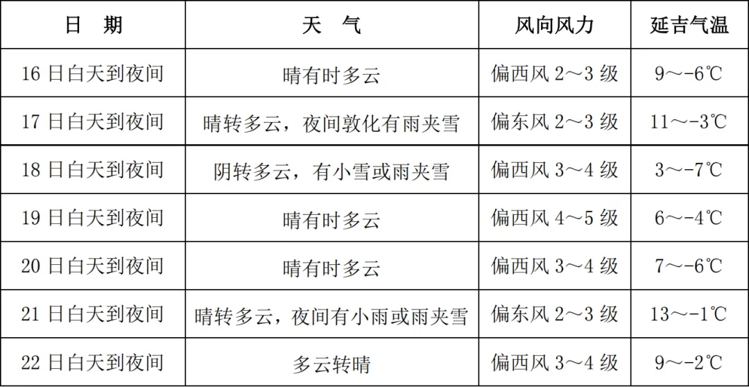 주기상국에 따르면 이번 주 우리 주의 전반적인 날씨추세는 기온이 다소 높고 강수량이 적을 전망이다. 전 주 평균 기온은 1℃ 안팎으로 평년 동기보다 1.5℃ 정도 높을 예정이다. 이번 주 기온 변화가 비교적 클 것인바 16일과 17일에 기온이 높고 18일에 기온이 뚜렷이 하락하겠으며 19일에 기온이 상승하고 22일에 다시 하락할 전망이다. 전 주 평균 강수량은 1mm 내지 3mm로 평년 동기보다 1mm 정도 적을 예정이다. 18일에 눈이나 진눈까비가 있겠으며 21일 밤에 비나 진눈까비가 있을 전망이다.