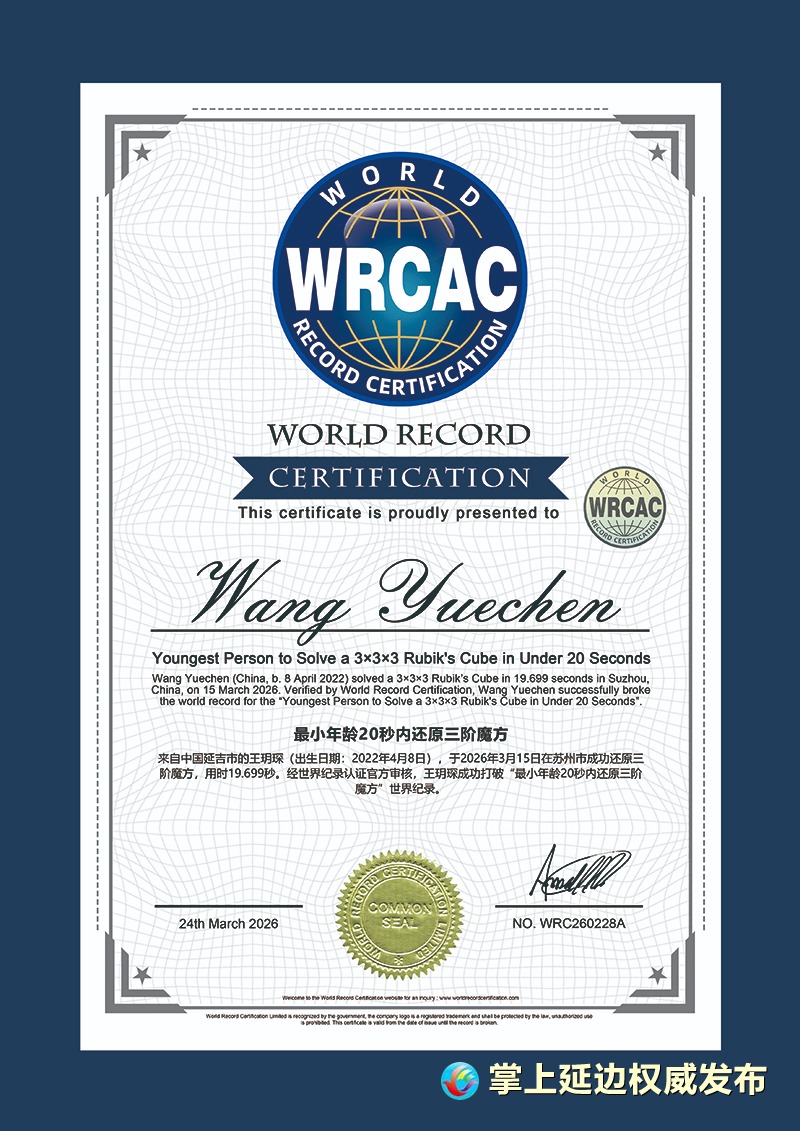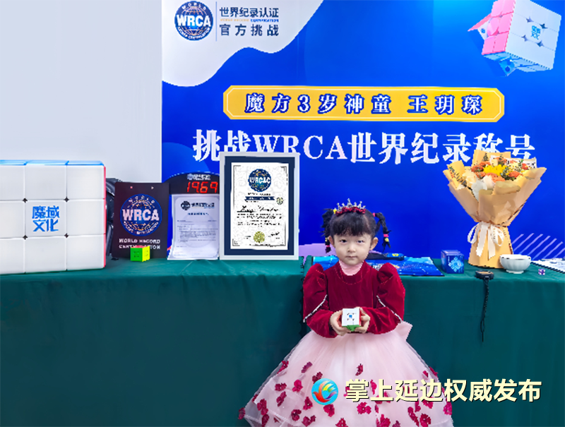 일전 연길 3세 녀아 왕월침이 WRCA 지능 발달 인증관이자 50개 세계기록 보유자인 엽가희와 디지털화용도 세계기록 보유자인 엽신초의 증견하에 19초에 3x3 큐브를 맞추는데 성공했다. 이로써 왕월침은 20초이내 3x3 큐브를 맞춘 최소 년령 WRCA 세계 기록을 세웠다.