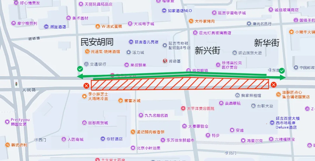 시공기간 인민로는 2차선 왕복 통행하며 단결로, 애단로, 해란로, 삼꽃거리 등 주변 도로로 우회하는 것을 권장합니다. 광범한 교통참여자들은 출행시간과 출행로선을 합리적으로 계획하기 바라며 통행 차량과 주민들에게 불편을 드리는 점 량해 부탁드립니다. 협조에 감사드립니다!