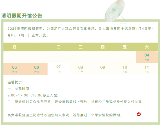 2026년 청명절 휴가기간 광범한 관람객의 문화수요를 충족시키기 위해 오대징국토수복기념관은 4월 4일부터 4월 6일(월요일)까지 정상 개방한다.
