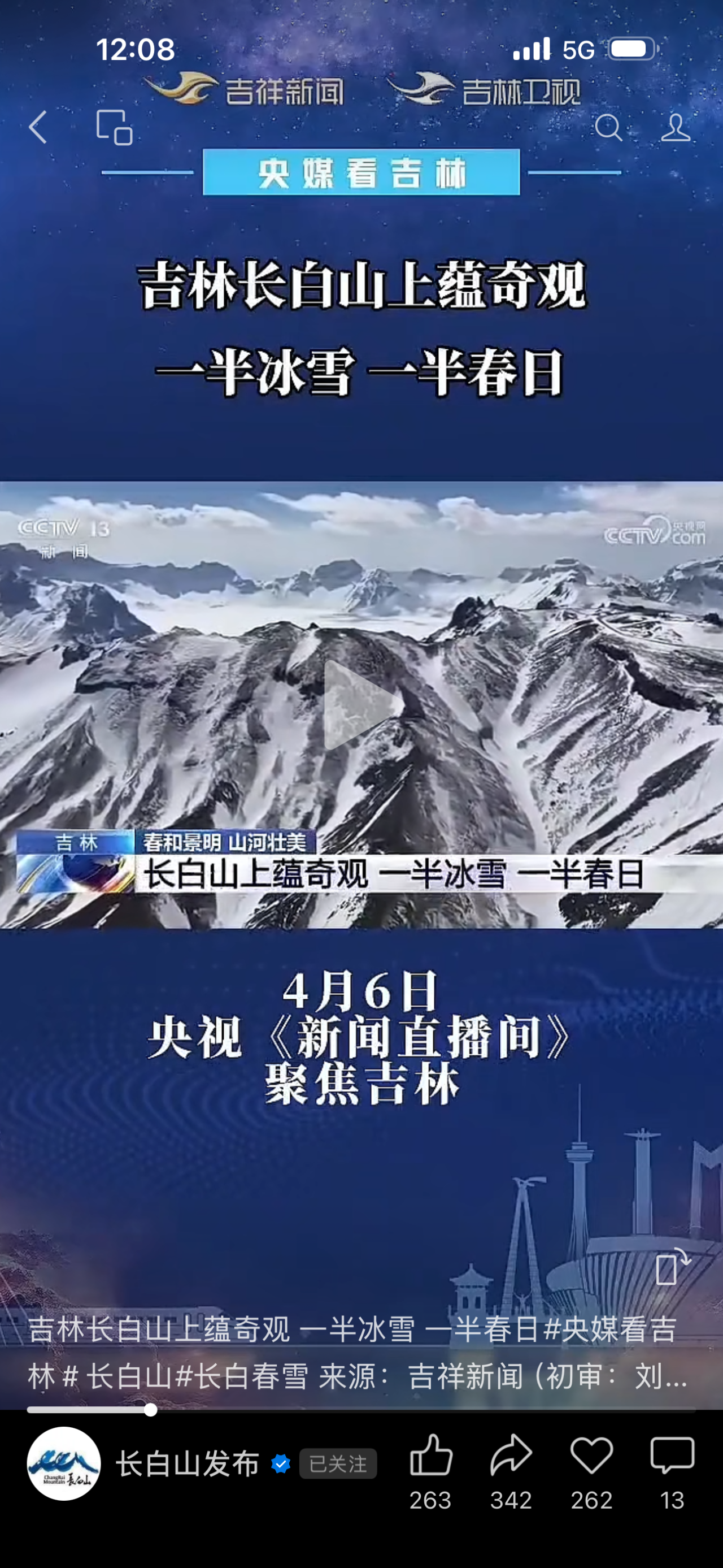 4월 6일, 중앙TV<뉴스생방송실>에서 '장백산 요즘 장관'이라는 보도가 방송됐다.