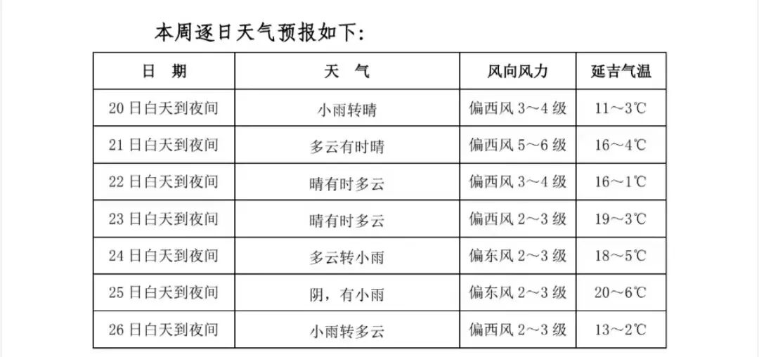 주기상국에 따르면 이번 주 우리 주의 총체적 날씨추세는 기온이 정상이고 가랑비가 자주 내릴 것으로 예상된다. 전 주 평균 기온은 9℃ 안팎으로 평년 동기와 비슷할 것으로 보이며 21일부터 기온이 오르고 26일에 기온이 하강할 것으로 예상된다.