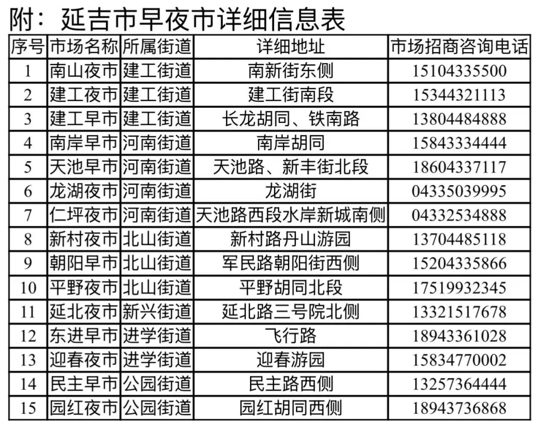 현재 각 아침시장과 밤시장은 로점 배치를 완료하고 각종 상품이 구전해 시민들이 오가며 구매하는 모습이 활기차면서도 따뜻한 생동감이 넘쳐난다. 소비환경을 지속적으로 최적화하고 시민과 관광객들의 체험을 향상시키기 위해 연길시 관련 부문과 각 시장의 운영단위들은 식품안전감독 관리, 환경위생 정돈, 경영질서 규범화 등 사업을 정기적으로 전개해 안전하고 깨끗하며 쾌적한 소비공간을 조성하는 데 전력을 다할 방침이다.