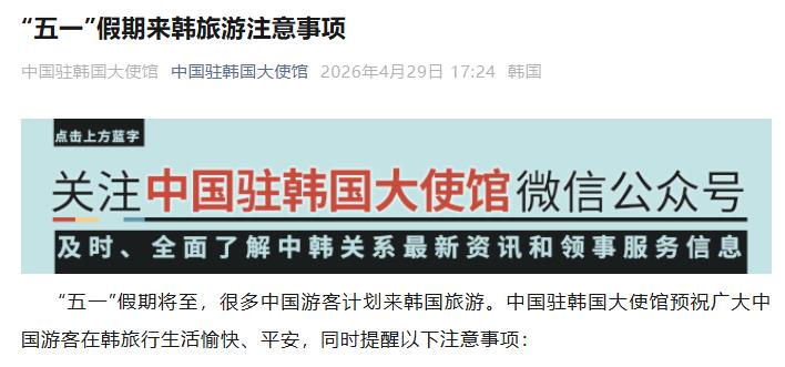 로동절련휴가 다가오면서 많은 중국관광객들이 한국을 방문하게 된다. 한국주재 중국대사관은 중국관광객들이 즐겁고 평안하게 한국관광을 즐기기 바랐으며 아울러 다음과 같은 주의사항을 발부했다.