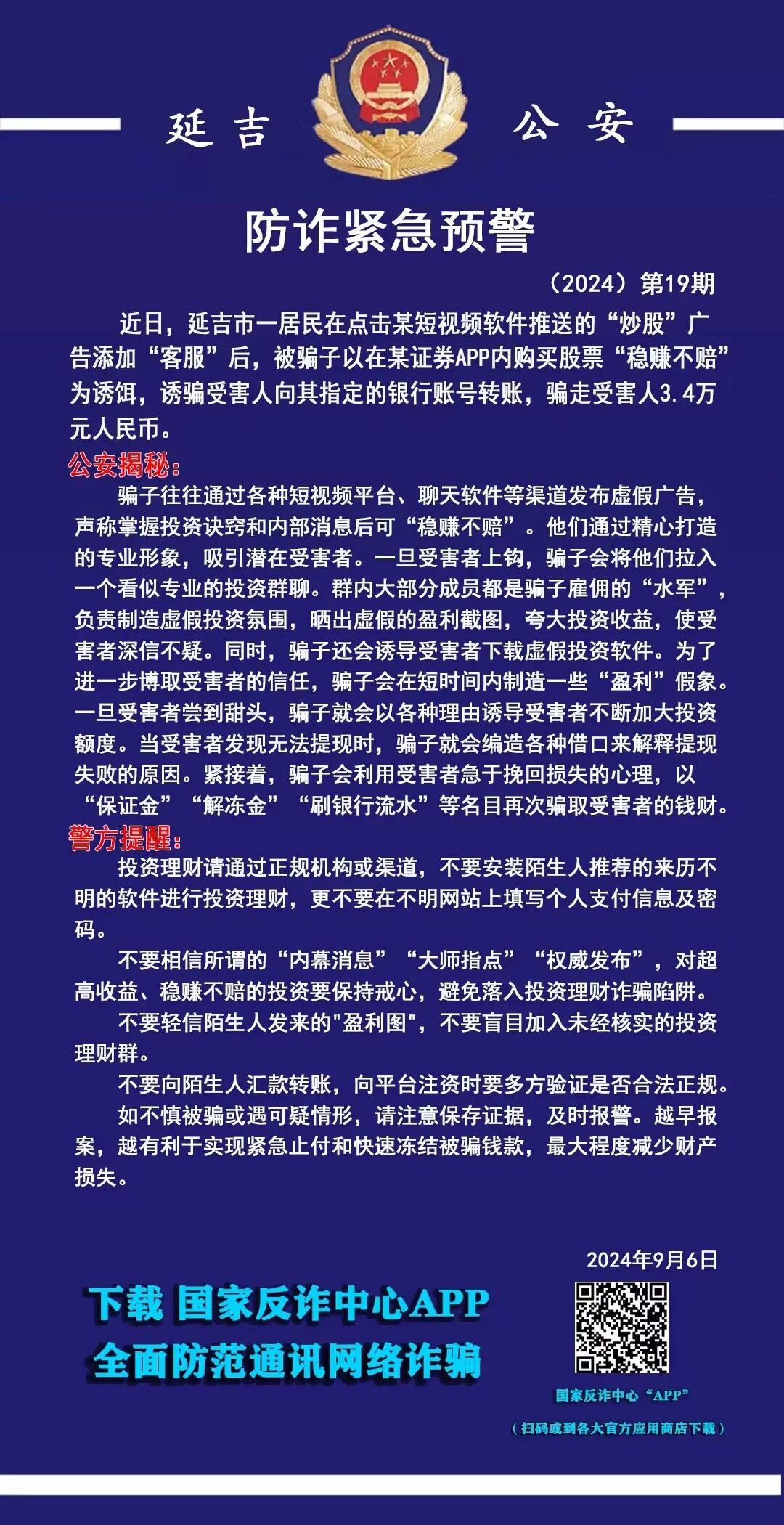 최근 연길시 한 주민이 모 미니영상 소프트웨어에서 발송한 '주식 투자' 광고를 클릭하여 '고객서비스'를 추가한 후 모 증권APP에서 주식을 사면 '안정적으로 벌고 손해를 보지 않는다'는 사기군의 말에 유혹되여 지정된 은행계좌...
