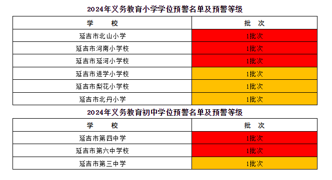 의무교육 학생모집사업이 평온하고 질서있게 전개되도록 보장하고 광범한 학부모들이 합리적인 예기를 할 수 있도록 인도하고저 아래 2024년 연길시 의무교육학교 입학정원 조기 경보 정보를 발부합니다.