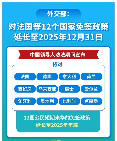 중국과 외국간의 인적 교류를 더욱 촉진하기 위해 중국은 프랑스, 독일, 이딸리아, 네덜란드, 에스빠냐, 말레이시아, 스위스, 아일랜드, 헝가리아, 오스트리아, 벨기에 및 룩셈부르크 12개국에 대한 비자면제정책을 2025년 1...