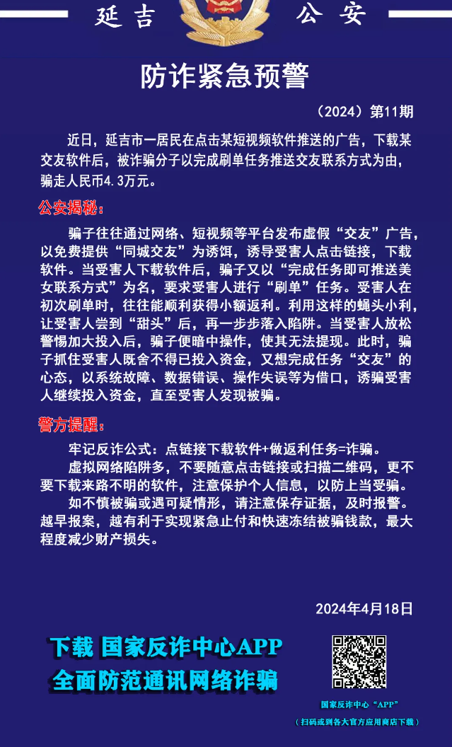 최근 연길시 한 주민이 모 미니영상 소프트웨어에서 전송한 광고를 클릭하고 모 교제 소프트웨어를 다운받은 후 사기군으로부터 허위구매를 완성하면 교제 련락처를 준다는 사기에 넘어가 4.3만원을 피해보았다. 공안폭로