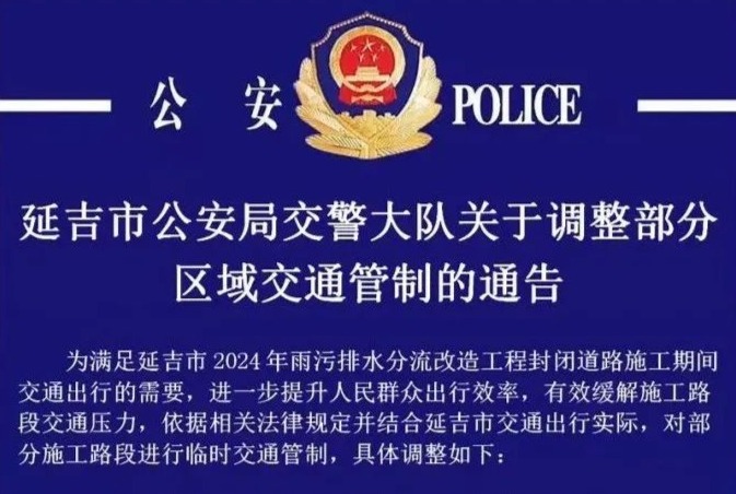 부분 구역 교통관리통제를 조정할 데 관한 연길시공안국 교통경찰대대의 통고연길시 2024년 비물오수배수분류개조공정 도로봉쇄시공 기간 교통출행의 수요에 만족주고 인민군중의 출행효률을 일층 제고시키며 시공도로구간 교통압력을 효과적...