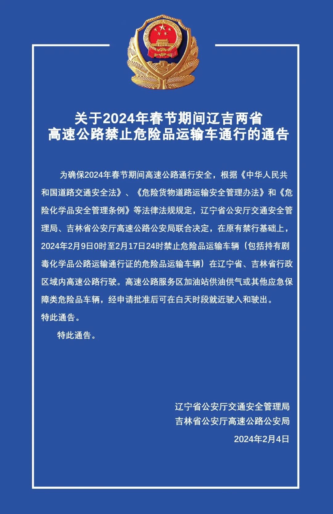 료녕성과 길림성 고속도로 위험물품운수차량 통행금지에 관한 통고