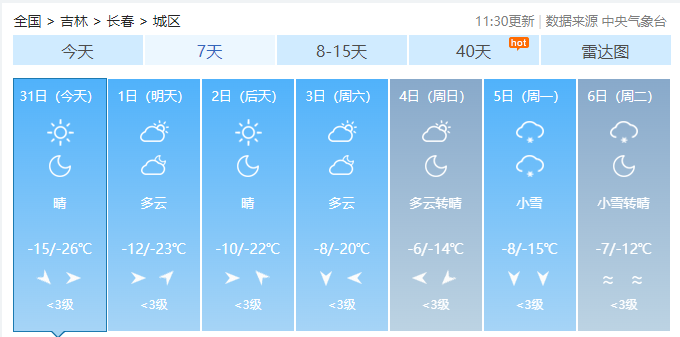 1월 31일부터 미래 일주일 동안 길림성의 평균기온은 -14℃ 좌우이다. 전성 평균 강수량은 3.0밀리메터 좌우이다.특히 주의해야 할 것은 2월 5일부터 6일까지 료원, 길림 남부, 통화, 백산, 연변, 장백산보호구에는 중간...