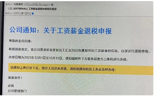 최근 시민 류녀사는 출근할 때 ‘내부통지’로 명명된 메일을 받았다. 메일은 “국가 규정에 따라 회사는 2022년도의 급여정보를 정리하고 세금환급신고를 위해 아래의 세무국 큐알코드를 스캔하여 처리하기 바란다.”라는 내용이였다....