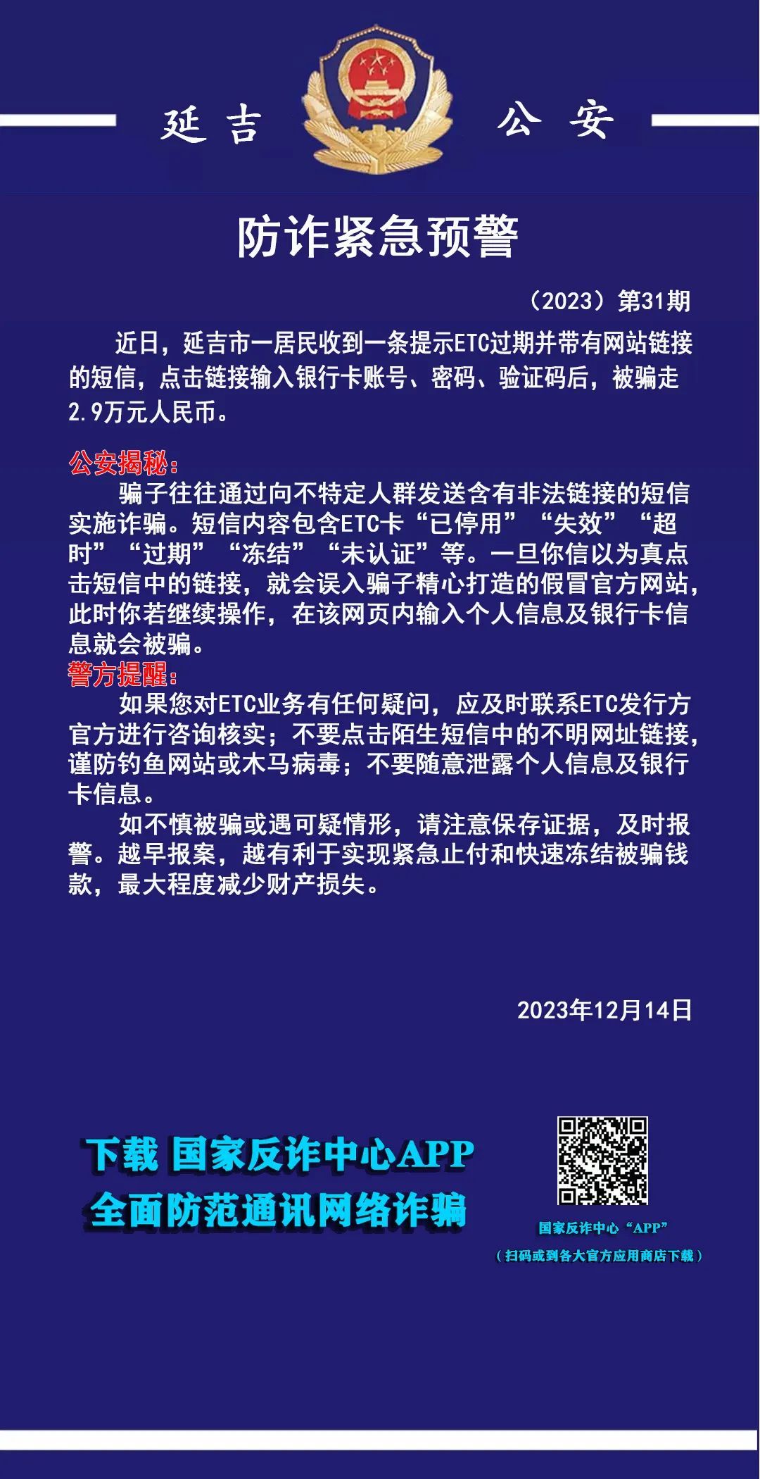 최근 연길시 한 주민은 ETC 만기 알림과 함께 사이트 링크가 적힌 메시지를 받았다. 이에 그는 링크를 클릭하고 은행카드계좌, 비밀번호, 인증코드를 입력했는데 바로 2.9만원을 사기당했다.공안 폭로