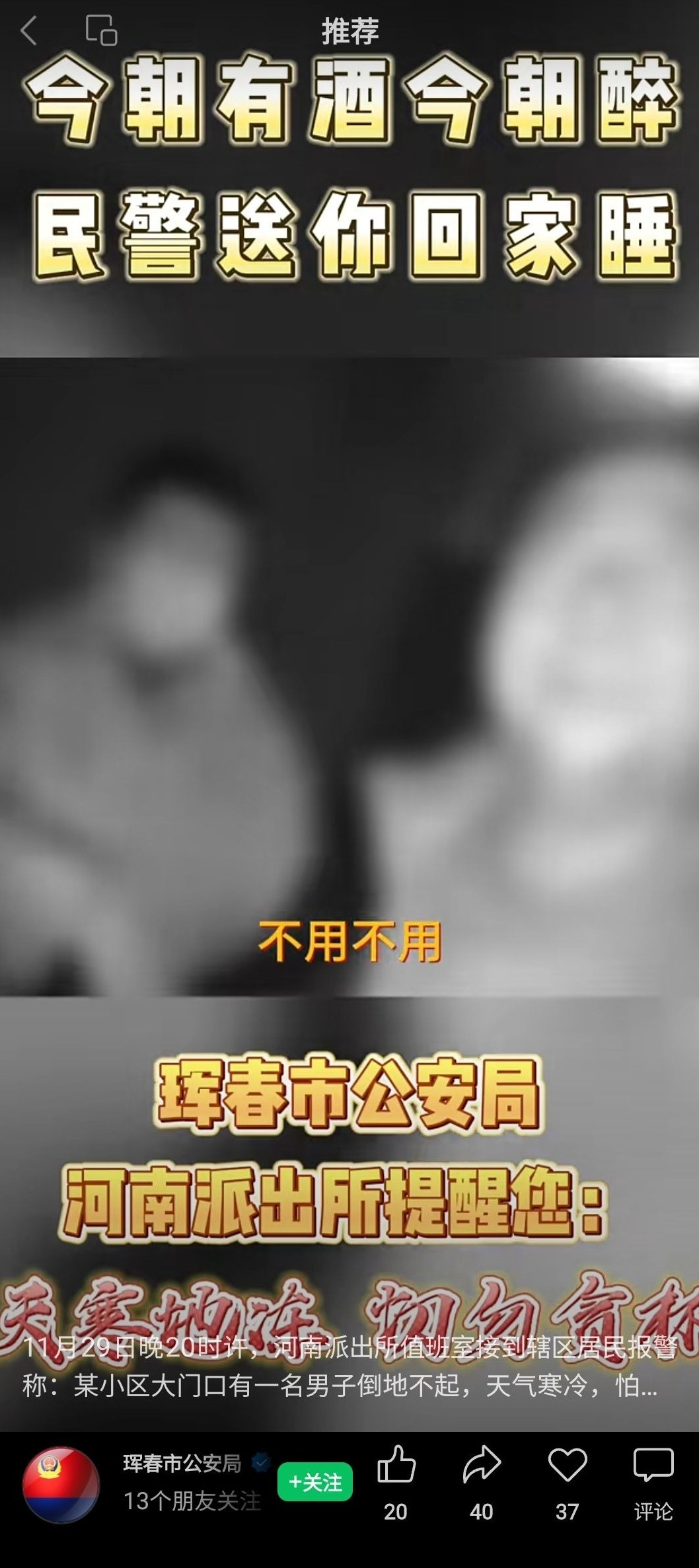 11월 29일 저녁 20시경, 하남파출소 민경은 관할구역내 주민으로부터 모 주택단지 대문입구에 한 남성이 쓰러져 일어나지 못하고 있는데 추운 날씨에 일이 생길가봐 걱정된다는 제보를 받았다. 민경은 즉시 현장을 찾았고 대문입구...