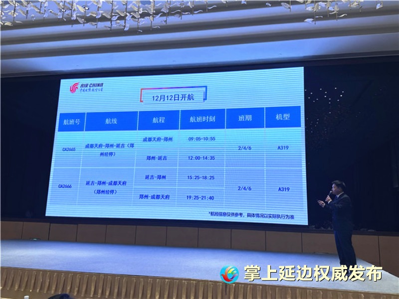 12월 4일 연변주—성도항공관광추천소개회에서 알아본 데 따르면 연길—정주—성도(정주 경유) 항로가 12월 12일 회복되는데 환승하지 않고 고속철을 리용하지 않고도 5.5시간밖에 걸리지 않는다고 한다.료해에 따르면 CA2665...