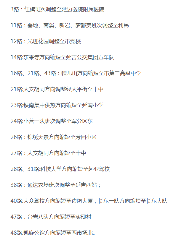 11월 27일 연길시에 눈이 내리면서 부분적 도로구간에 적설, 결빙 상황이 발생했다. 차량과 승객들의 안전을 보장하기 위해 연길시공공뻐스집단유한회사는 부분적 공공뻐스 로선을 다음과 같이 조정했다.