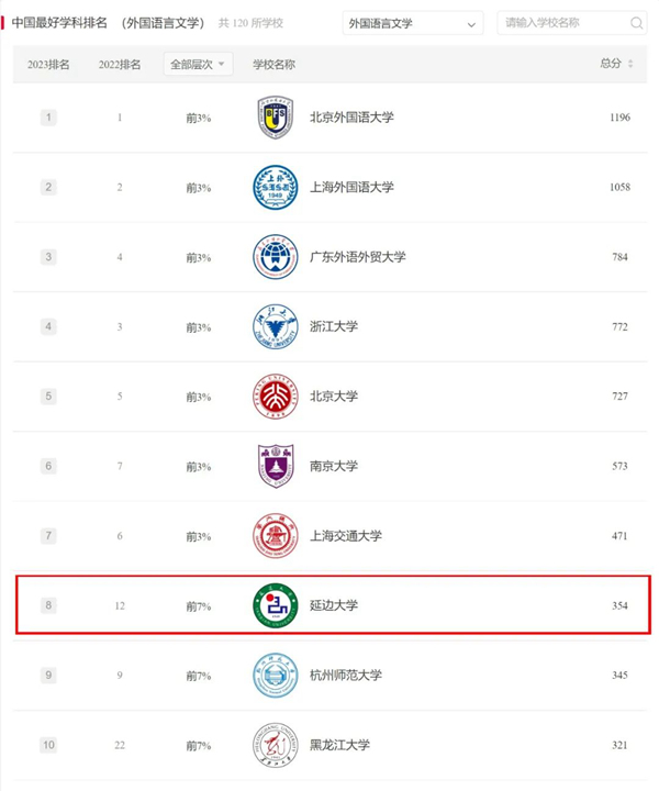 11월 8일, 랭킹은 ‘2023 랭킹중국 가장 좋은 학과 순위’를 정식으로 발표했다. 연변대학 외국언어문학학과가 제 8위를 기록해 2022년보다 4단계 올라섰다.2017년 9월, 조한문학원 아시아-아프리카언어문학학과를 핵심으...