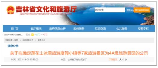 6일, 길림성문화관광청은 <련화산빙설관광리조트 등 7개 관광지를 4A급 관광지로 확정할 예정에 관한 공시>를 발부했다.<관광지 품질등급 획분 및 평가> 국가표준 및 <관광지 품질등급 관리방법>에 따르고 관련 시(주) 문화관광...