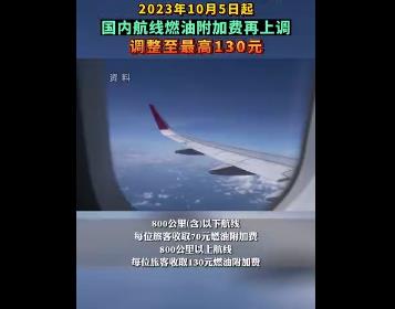 기자가 중국민용항공국에서 료해한데 따르면 2023년 10월 5일(발권일)부터 국내선 유류할증료 부과기준을 인상한다고 한다.800km(포함) 이하 구간은 승객당 70원, 800km 이상 구간은 승객당 130원으로 조정 전에 비...