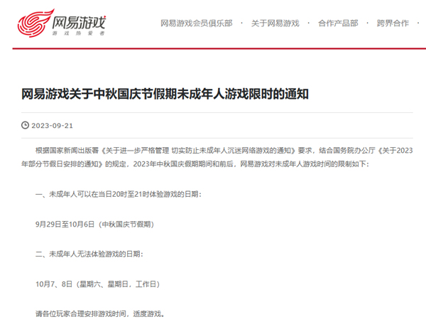 일전 텐센트는 추석, 국경절기간 미성년자의 게임시간 제한통지를 발표했다.통지에 근거하면 9월 29일부터 10월 6일 기간 미성년사용자는 매일 20