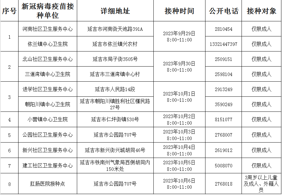 아래 추석, 국경절 기간 각 신종 코로나 바이러스 접종점의 구체 접종시간에 대해 다음과 같이 통고한다.