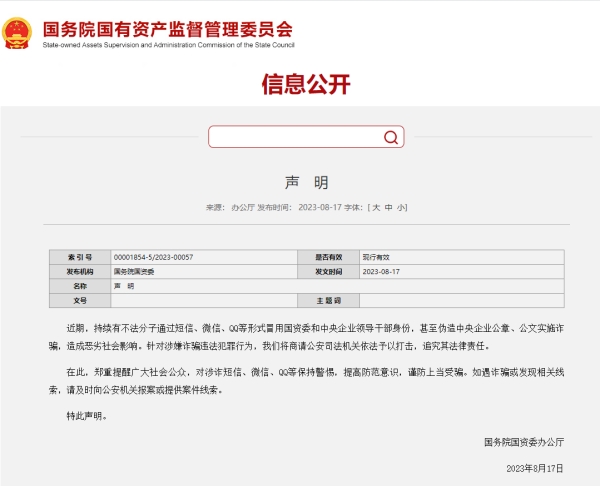 사기 조심! 국무원 국유자산감독관리위원회 성명 발부