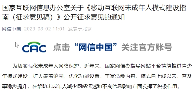 100044 봉투에 ‘이동인터넷 미성년자모드 구축 지침 의견수렴’이라는 문구를 표기해주기 바란다.의견접수 마감일은 2023년 9월 2일이다.국가인터넷정보판공실2023년 8월 2일