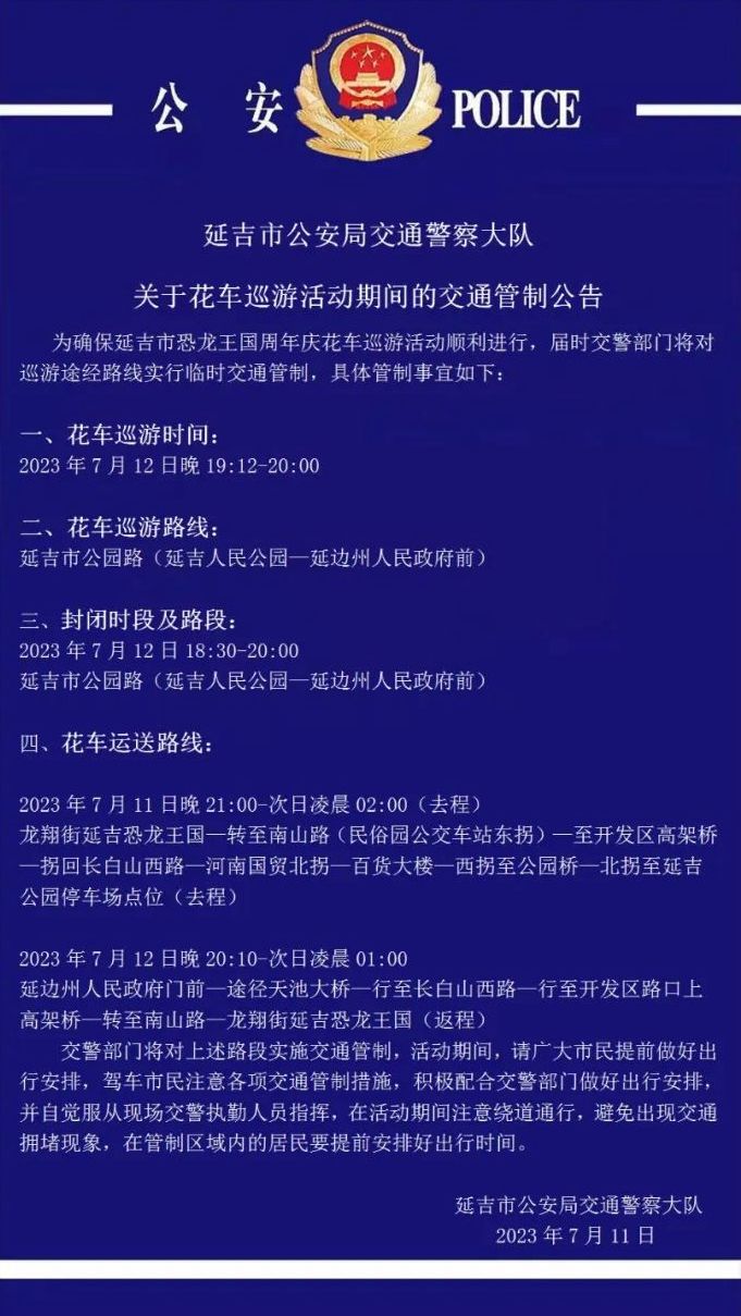 연길공룡왕국 1주년 기념 꽃차 퍼레이드 활동의 순조로운 진행을 위해 교통경찰부문은 관련 도로구간에 대해
