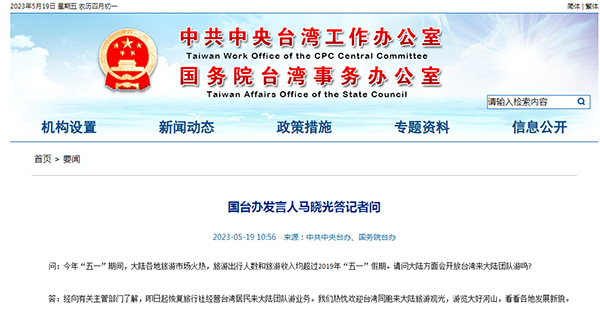 국무원 대만사무판공실 선포: 19일부터 회복!
