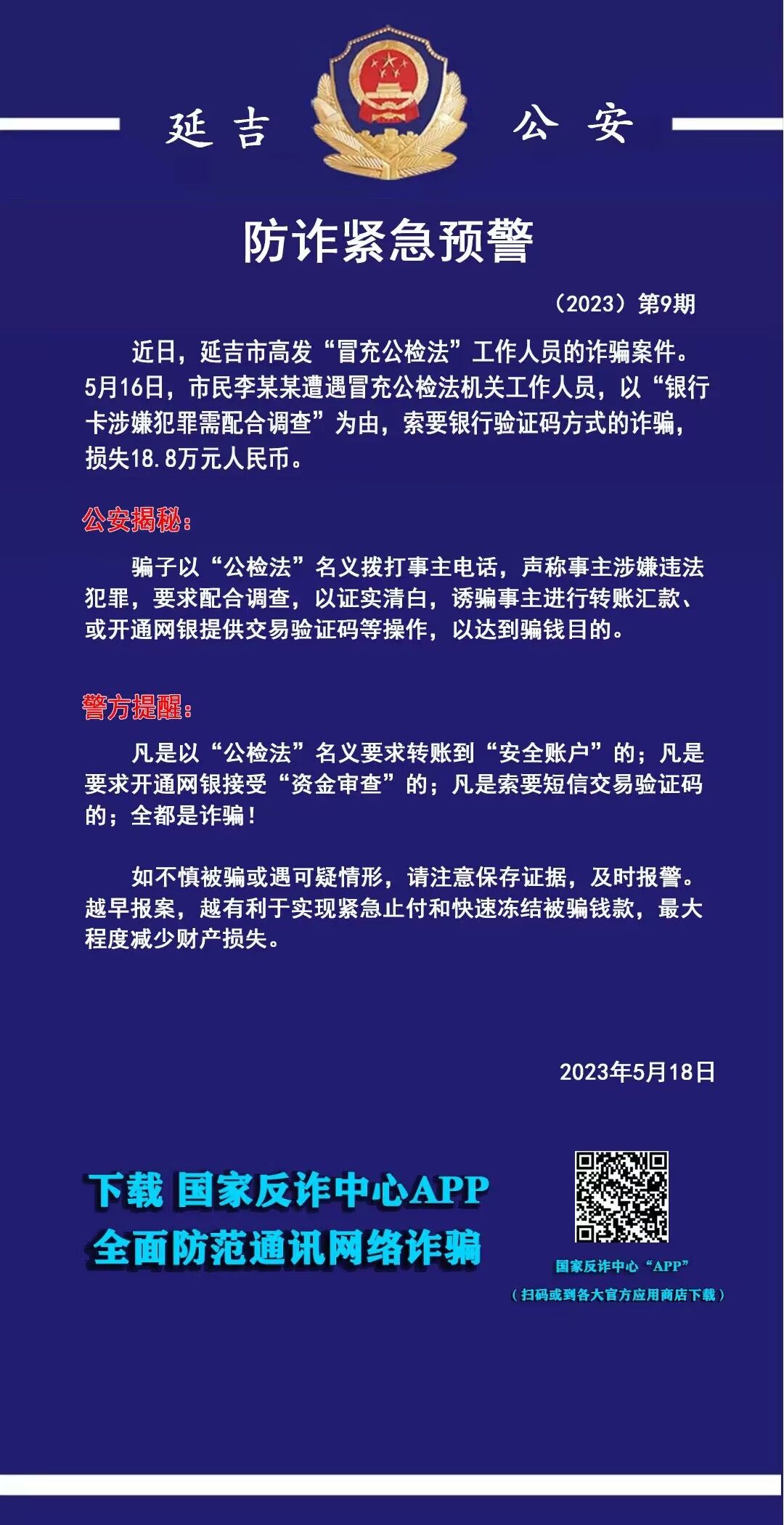 사기방지 긴급조기경보(2023)제9기요즘 연길시에 '공안, 검찰원, 법원' 사업일군 사칭 사기사건이 빈번히 발생했다. 5월 16일, 시민 리모모는 '공안, 검찰원, 법원' 사업일군으로 자칭하는 사람으로부터 '은행카드가 범죄 ...