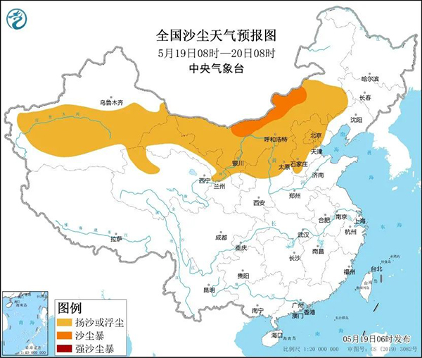중앙기상청은 5월 19일 6시에 계속하여 황사청색주의보를 발령했다.찬공기와 강한 바람의 영향으로 5월 19일 8시부터 20일 8시까지 신강 남부와 동부, 청해 서북부, 내몽골 ...