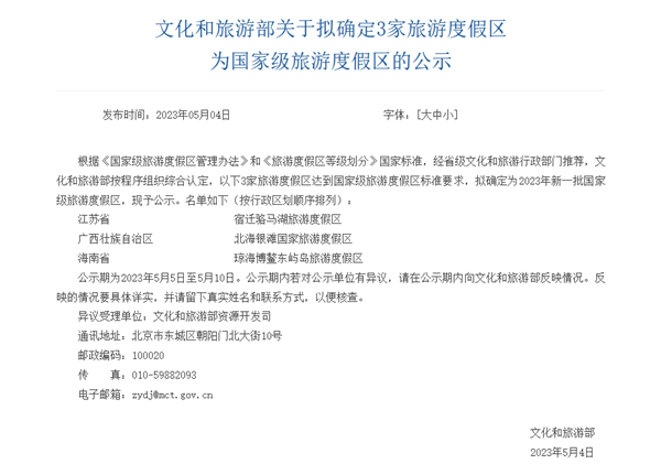 문화관광부의 소식에 따르면 <국가급 관광휴가지관리방법>과 <관광휴가지 등급획분> 국가표준에 근거하고 성급 문화관광행정부문의 추천을 거쳐 문화관광부는 절차에 따라 종합인정을 조직했는데 아래의 3개 관광휴가지가 국가급 관광휴가지...