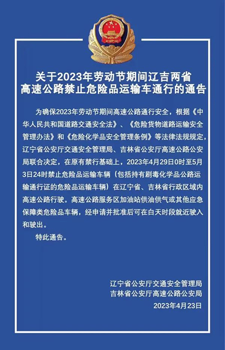 2023년 로동절기간 고속도로 통행안전을 보장하기 위해 <중화인민공화국 도로교통안전법>, <위험물 도로운수 안전관리방법>과 <위험화학품 안전관리조례>등 법률법규에 따라 료녕성공안청 교통안전관리국, 길림성공안청 고속도로관리국은...