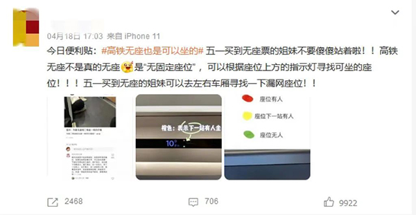 최근 온라인상에서 #고속렬차 무좌석티켓도 앉을 수 있다#라는 화제로 열띤 토론을 벌이고 있는 가운데 한 네티즌은 “고속렬차 무좌석티켓은 진짜 좌석이 없는 것이 아니라 ‘고정좌석이 없는 것’으로 좌석 상단에 위치한 표시등을 보...
