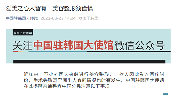 한국주재 중국대사관, 한국행 ‘미용성형 관광객’에 주의 당부